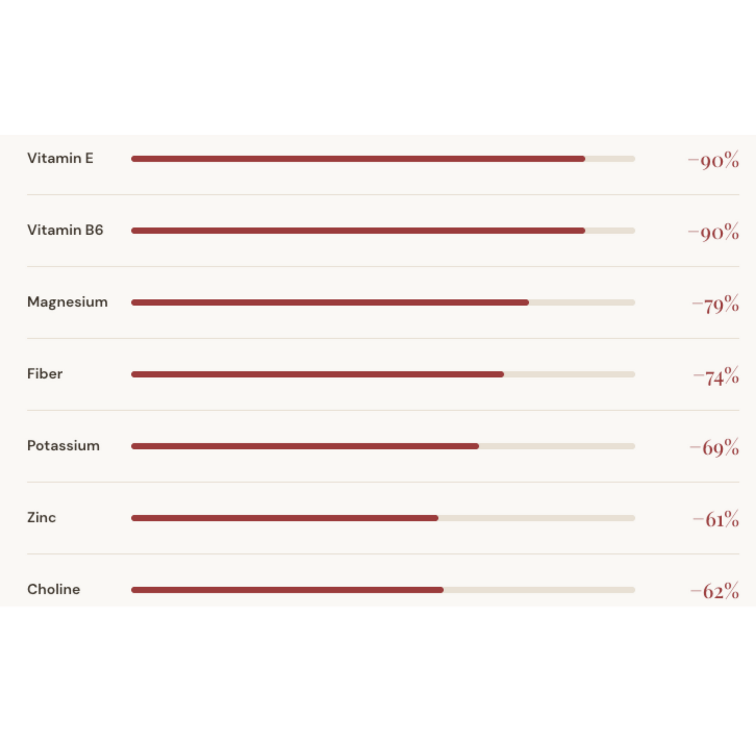 Percentage of nutrients lost when whole wheat is refined into white flour. Data from USDA FoodData Central.