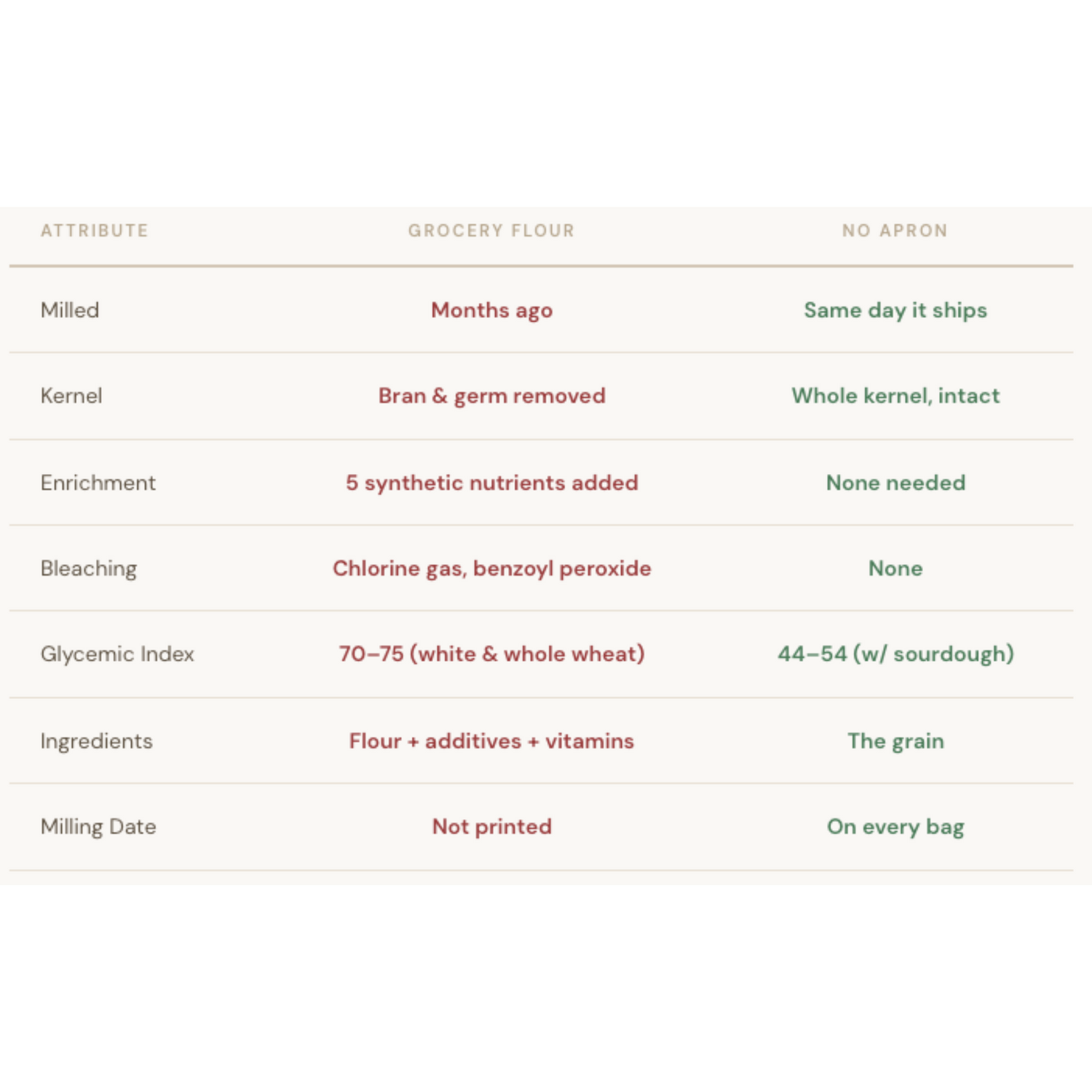 One ingredient. Milled fresh. No bleaching. No bromate. No enrichment needed.